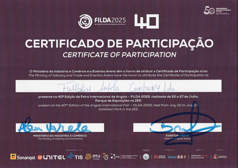 福盈安哥拉有限公司(Full Bliss Angola Company Lda)于2025年7月22日至27日在安哥拉羅安達–本戈經濟特區參加第40屆羅安達國際展(FILDA)。